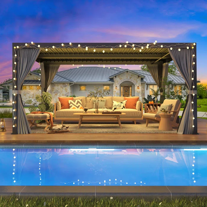 - Curtain & netting Includes removable privacy curtains and nets to help keep bugs out of the gazebo and provide privacy. There are straps on the upper, middle, and lower parts near the column, which can prevent curtains and mesh from flying around in strong winds. This is the dream louvered pergola for gardens, backyards, pools, beaches, patios, and decks.
